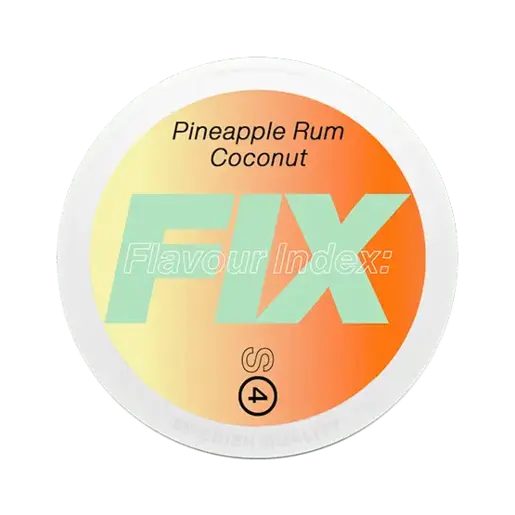 FIX Pineapple Rum Coconut #4 – tobaksfria nikotinpåsar med smak av ananas, kokos och rom. 20 prillor, 9,8 mg nikotin per prilla. Köp billigt snus online på xsnus.se.