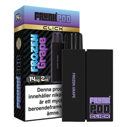 Frunk Pod Click Frozen Grape – Startkit bjuder på en intensiv druvsmak med en iskall finish. Startkit med batteri inkluderat på xsnus.se!
