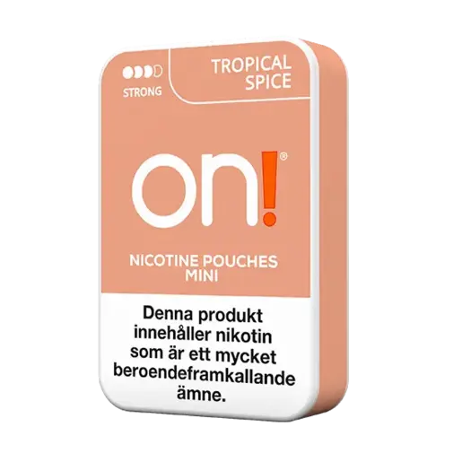on! Tropical Spice Strong erbjuder en exotisk tropisk smak med en kryddig twist och stark nikotinstyrka i ett mini-format. Perfekt för användare som söker en kraftfull och unik snusupplevelse. Köp billigt online på xsnus.se och njut av 20 prillor per dosa.